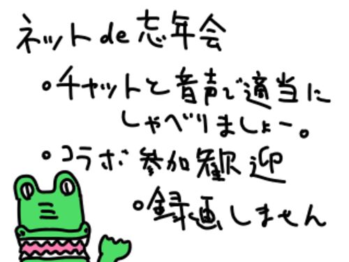 こーんばーんはー。 ネットde忘年会の2日目を21時から開始予定です! 今日も楽しくやっていけたらな~と思ってます! ここはリアルタイムで更新していく予定ですが、多くて5回くらいになるかな? 話が盛り上がると更新タイミングを逃しますが、それはそれで…